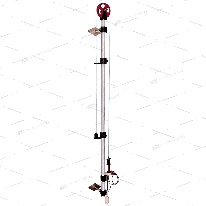 This machine has brass pipe upright 240cms (8 ft.) long graduated in cms. Metal fittings and arrangement for exact adjustment, vertical and horizontal. No dropping platform. Electric release weights start falling instantly circuit is broken. Wheel of aluminium 10cms. Diameter is carefully adjusted and balanced on steel agate bearing; platform with sliding weights and over weights.