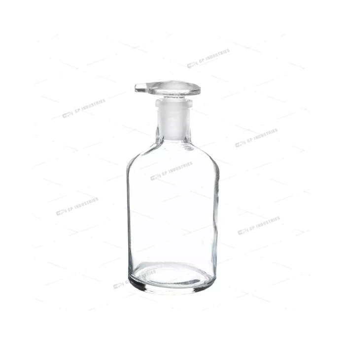 Clear glass bottle with grooved glass grip stopper and spout.