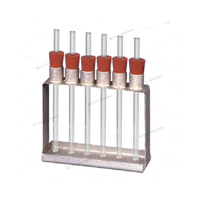 A 90mm high metal frame having trough of 115 x 40 x 10mm size. Frame having 6 holes fitted with corks, through pass capillary tubes of different bore 150mm in length.