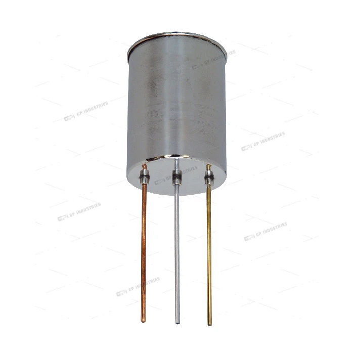 A copper cylindrical vessel of 105 x 85mm Ht x dia is fitted with 5 different 150 x 3mm Length x dia metal rods of copper, brass, iron, aluminium and zinc, each having adjustable index mark at its base.