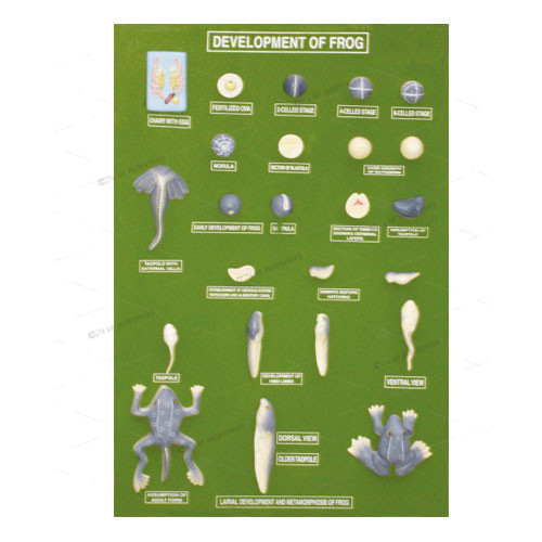 A set of 24 models showing the various stages in the development of a frog, from egg to adult. Arranged on a large size plastic base.