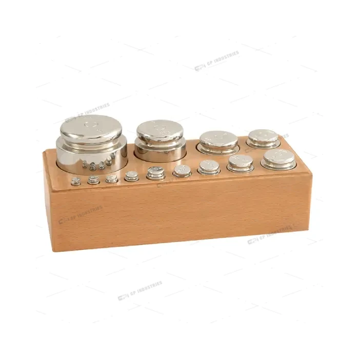 Precision of chrome plated brass in 1-2-2-5 series. Minor fractionals are of aluminium and major fractionals are of Brass, 10 mg rider is nickelled, complete with tweezers and gram fractionals in screw cap plastic box to protect them from loss. Set is in polished wooden box.