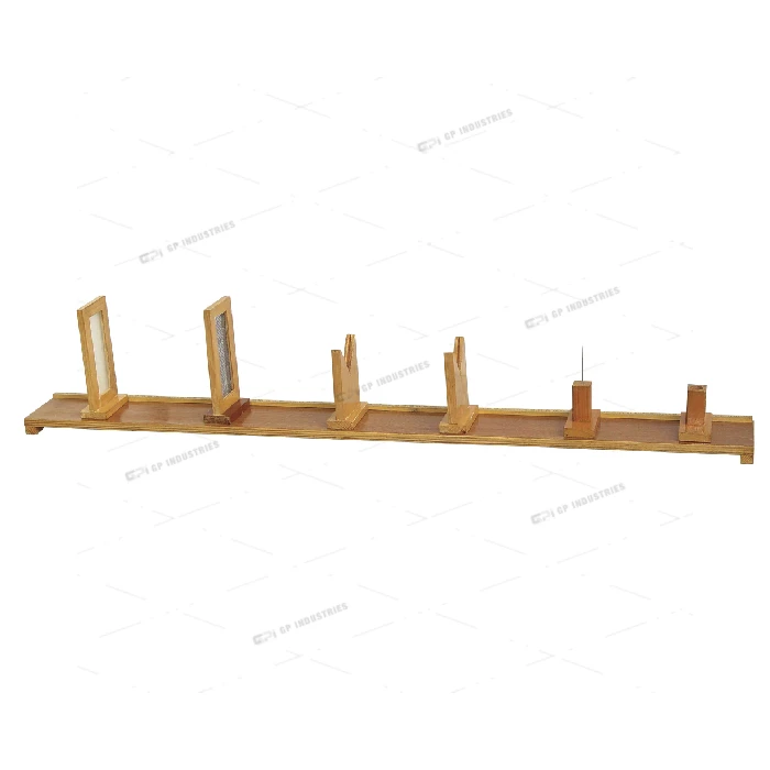Comprising a wooden base board 1100x115mm with one meter scale divided in millimeters and figured at every centimeter fixed along the front edge and complete with following accessories, two white faced object and receiving screen, one plane mirrог 150х100mm, 4 lens holder V shaped, one needle mounted vertically in a short wooden rod in the centre of a wooden base.