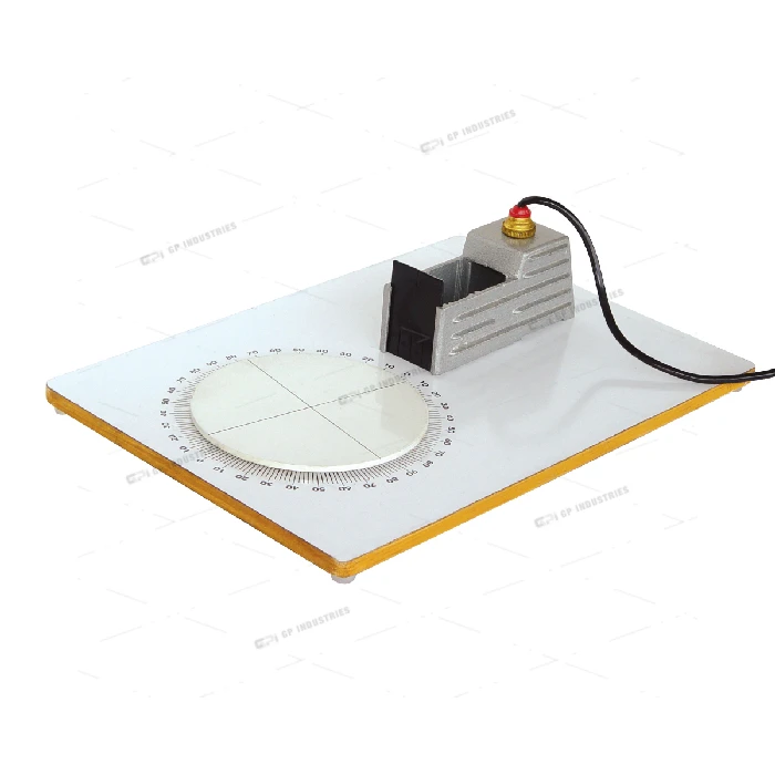 A compact visual teaching aid which is robust in construction wood board 400x280x13mm with matt white surface, mounted on rubber feet carries a circular scale with four quadrants 0-90° graduated every 2°, with two lines at right angles. The ray boх provided with slots to accommodate metal slits, colour filters, lenses etc., and is fitted witha12V 24W line filament.