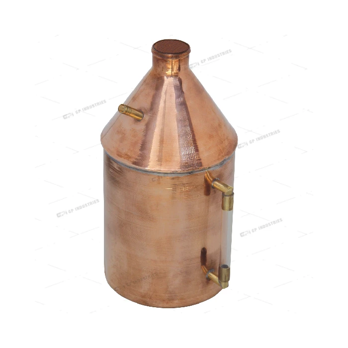 A copper vessel having a cylindrical body and a conical top with a short neck for a bung. Fitted with a finger loop handle, steam outlet tube refilled for rubber tubing, and a glass water gauge tube.