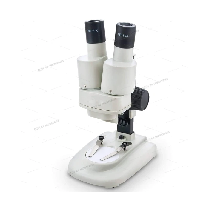 The EISCO Beginner Stereo Microscope features interchangeable 10x18mm pairs, a 2x objective, incident LED illumination, and a white stage plate. The binocular viewing head has a 55 to 75 mm interpupillary range and a fixed vertical inclination to simplify viewing for young users. The LED light is powered by two AA batteries, allowing the microscope to be used away from wired power sources. The bilateral coarse focus facilitates use for both right- and left-handed users. The stage has a white stage plate that provides contrast with light and dark-colored specimens and stage clips that secure the specimen during viewing. The microscope has a 2-3/4″ (70 mm) working distance. The all-metal/ABS construction is durable and stain-resistant.