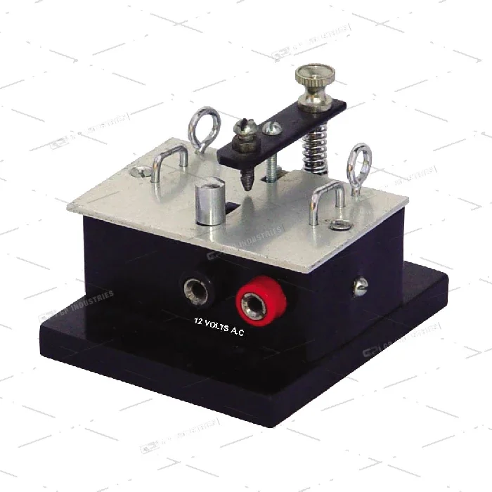 Operates on 12 V a. c. The timer employs electromagnet, with spring loaded armature which vibrates above a support table for a carbon paper disc. Paper tape, drawn through guides on the table, is struck by a dotting screw carried on the armature. Additional with extra guides accommodate 4.5mm external diameter rubber tubing for the ‘Pearls in air’ water drop experiment. The peg on the support table is movable to allow maximum use of carbon paper discs. Supplied with 300m roll of tape and carbon paper discs. The ticker tape timer produces dots spaced at 1/50 or 1/60s intervals depending on main frequency.